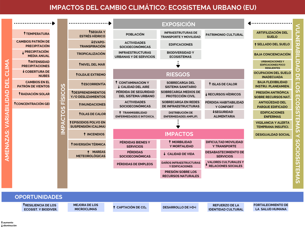 Figura 2 Esquema de impactos del cambio climático sobre el AT [Eco]Sistema Urbano. Fuente: Elaboración propia a partir de IPCC, 2014.