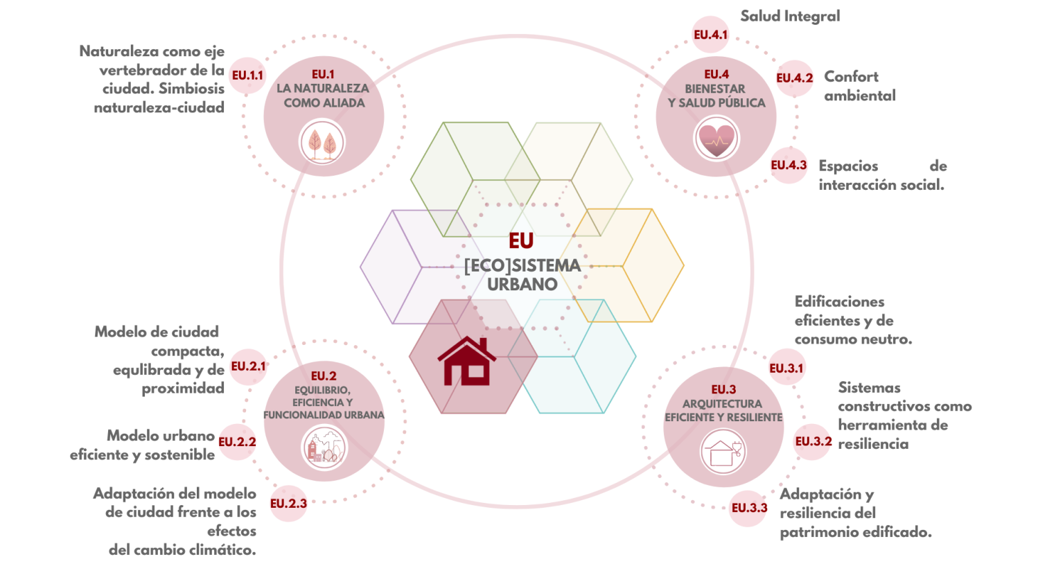 Desde el [Eco] Sistema Urbano se analizan los elementos que componen el espacio urbano, de manera que a través de una correcta planificación y ordenación del modelo urbano se puedan alcanzar unos parámetros de eficiencia en el consumo de los recursos, lo que se logra a través de un diseño equilibrado y funcional del conjunto usos y actividades dirigidos a garantizar la accesibilidad, la proximidad, el confort, bienestar y la salud de las personas, integrando la naturaleza como eje vertebrador del espacio urbano y transitando hacia un modelo de resiliencia en el tejido de las urbanizaciones y edificaciones frente a los efectos del Cambio climático.