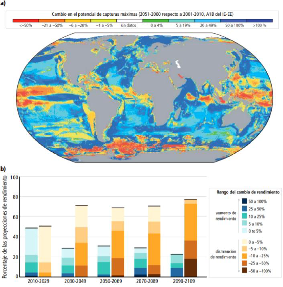 Figura 133. Riesgo del cambio climático en la producción de alimentos (a- capturas de especies marinas y b- rendimientos de los cultivos). Proyección 2010-2109. Fuente: Cambio climático 2014. Informe de síntesis (IPCC).