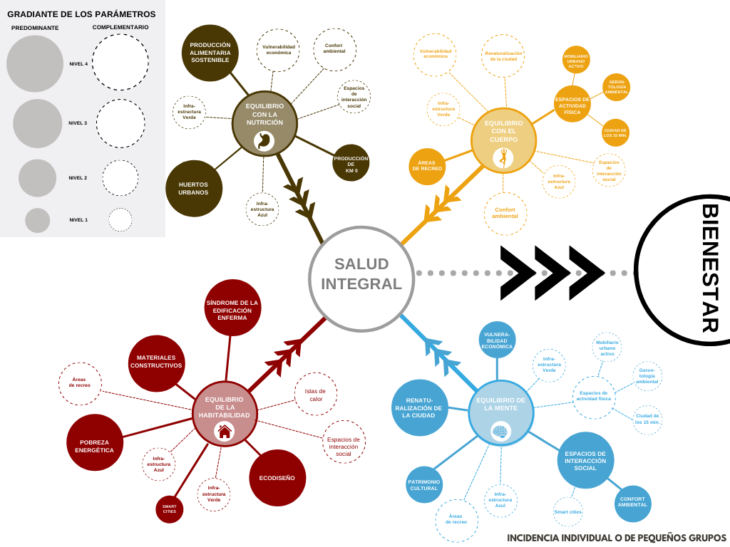 Nutrición, Actividad física, Habitabilidad, Espacios de convivencia, Diseño biofílico, Multifuncionalidad del espacio urbano.