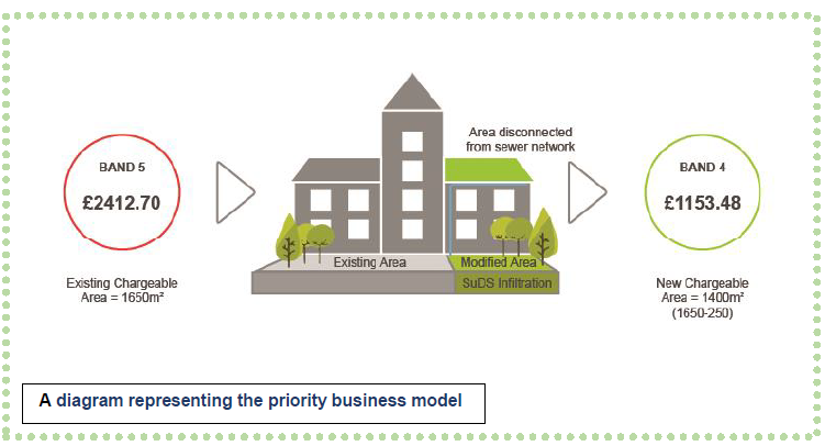 A nivel no doméstico, el proyecto se ha centrado principalmente en los drenajes sostenibles (SuDS), en los que los ahorros potenciales en las tasa de aguas residuales, podrían compensar el costo de instalación y proporcionar un retorno de la inversión.