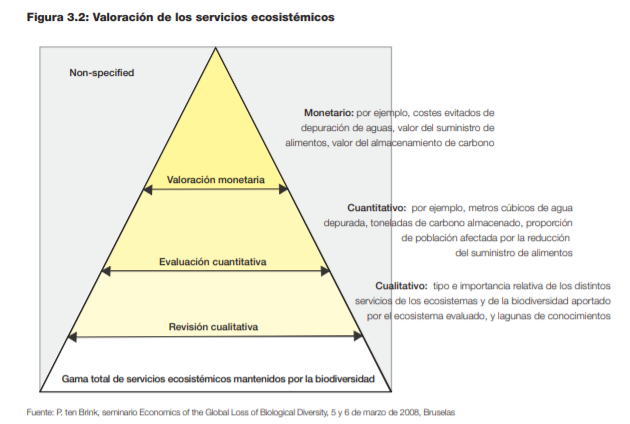 En el caso de los servicios de regulación o los servicios culturales, que no suelen tener un precio de mercado (salvo excepciones como la captura de carbono), la valoración económica es más difícil. No obstante, se vienen utilizando desde hace décadas diversas técnicas para calcular el valor no mercantil de los bienes medioambientales, algunas basadas en información de mercado que está indirectamente relacionada con el servicio (métodos de preferencias reveladas) y otras basadas en mercados simulados (métodos de preferencias declaradas). Estas técnicas ya se han aplicado, en la Evaluación de los Ecosistemas del Milenio.