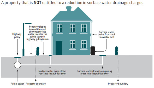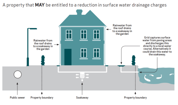Figura 5. Vivienda con conexión a drenaje sostenible y opción a reducción de tasa de alcantarilladlo y depuración y caso opuesto. Fuente https://www.unitedutilities.com/globalassets/documents/pdf/property_that_may_be_entitled_to_a_reduction_in_surface_water_charges_acc16.pdf