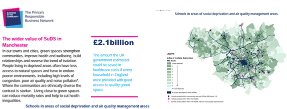 Figura 4. Valoración de la tasa de alcantarillado y depuración con y sin SbN de drenaje sostenible. Fuente https://www.greatermanchester-ca.gov.uk/media/4419/ignition-interim-report-april-21.pdf