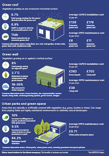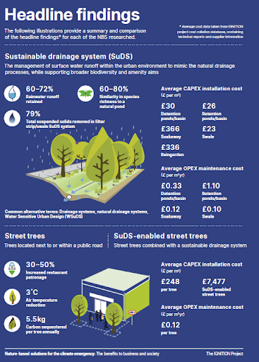 La ejecución de SbN requiere normalmente, de más esfuerzo inversor que la ejecución de infraestructura gris, en cambio su coste de mantenimiento es menor. Dado que la memoria de sostenibilidad económica considera en su evaluación los costes de mantenimiento de las infraestructuras, se apunta la oportunidad de realizar un estudio comparativo de los costes de mantenimiento de infraestructura gris y SbN. De este modo se visualizaría en un documento económico, exigido en la documentación que debe aportar el planificador urbanístico para las actuaciones de transformación, los beneficios de las SbN,. A continuación se evidencian los resultados obtenidos por el Proyecto IGNITION para cuatro tipos de SbN urbanas, en cuanto a su coste de ejecución, mantenimiento y los beneficios aportados: