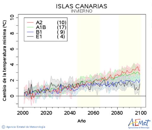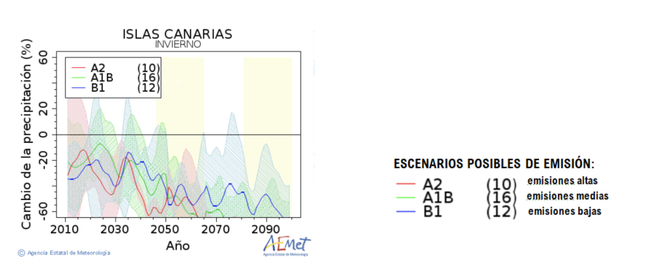 Para la determinación de cuál es la variación del clima, que permita distinguir la variabilidad climática pasada de la futura, se estudian las tendencias previstas por las hipótesis de cambio climático o modelos climáticos regionales (RCM). A continuación se muestra la proyección regionalizada para Canarias, para la variable cambio de la precipitación para el invierno, y dados tres escenarios posibles de emisión: