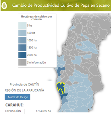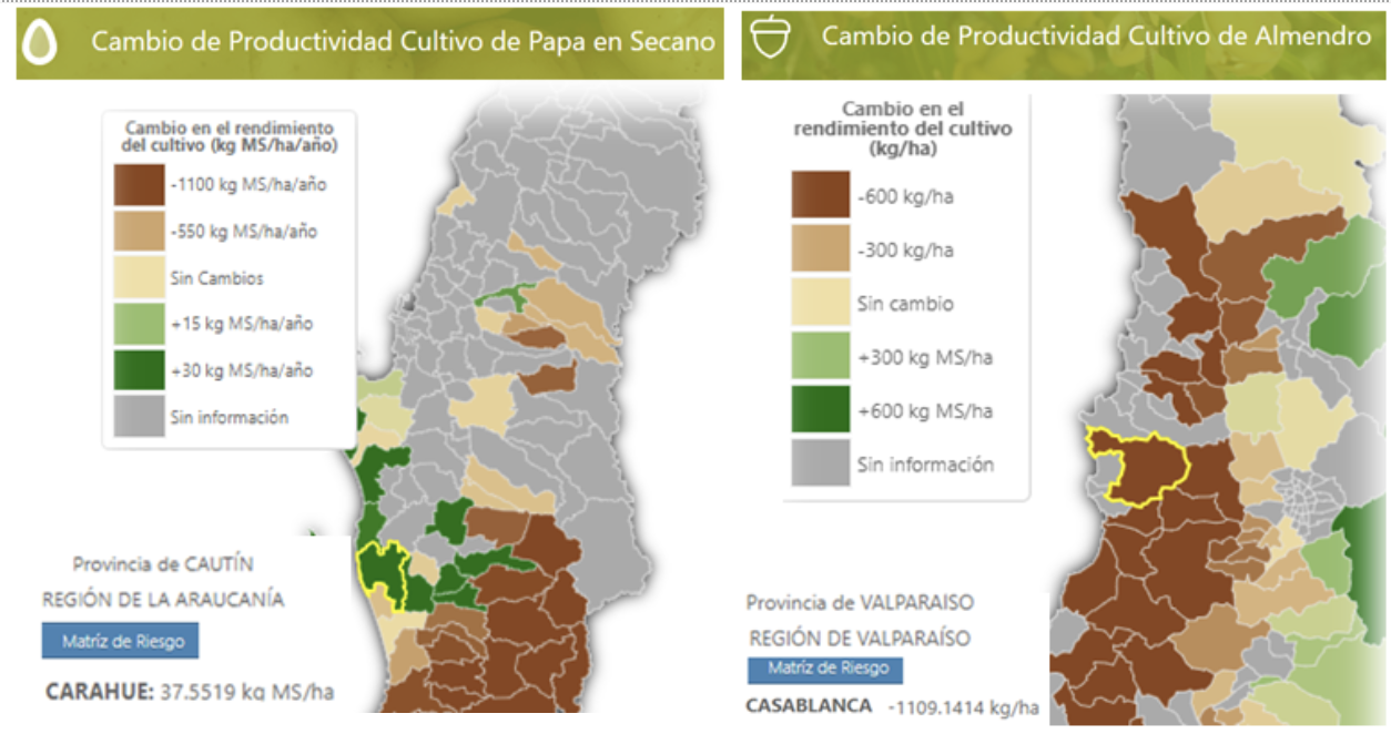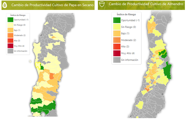 Se continúa con el ejemplo anterior del Atlas Climático de Chile, con una representación de los rendimientos de los cultivos de papa de secano y de almendro, bajo escenario de altas emisiones RCP8.5.