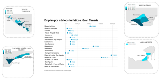 Figura 63 Viajeros Alojados y Empleo por núcleos turísticos. Gran Canaria. 2019. Fuente: Promotur e