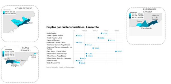 Figura 64 Viajeros Alojados y Empleo por núcleos turísticos. Lanzarote. 2019. Fuente: Promotur e ISTAC.