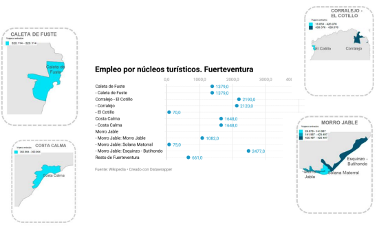 Figura 65 Viajeros Alojados y Empleo por núcleos turísticos. Fuerteventura. 2019. Fuente: Promotur e