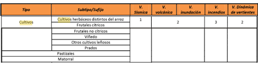 Para cada zona de exposición o superficie de cultivo expuesta, se podrá grafiar por polígonos el índice de vulnerabilidad total, conjugando los dos aspectos (vulnerabilidad del elemento expuesto frente a tipo de amenaza y vulnerabilidad del contexto socioeconómico) y una vez efectuados los cálculos se podrían considerar los mismos rangos que asigna el PDR a las zonas rurales (alto, medio y bajo).