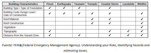 La metodología utilizada por los Planes Especiales de Protección Civil y Protección de Emergencias (PEINCA-Riesgo Inundaciones, etc.), estima el grado en que la vulnerabilidad varía, según el tipo de amenaza que se produzca y a la que se vea expuesto un elemento. En esa línea, la vulnerabilidad de las edificaciones y sus elementos constructivos, la plantea a partir de sus elementos constructivos, y así para la cimentación de una edificación indica, la existencia de un mayor grado de vulnerabilidad frente a inundaciones que la que pueda afectar a un elemento de cubierta de una edificación, que presentará un menor grado de vulnerabilidad a inundaciones, pero mayor grado de vulnerabilidad a vientos extremos.