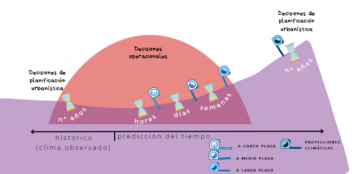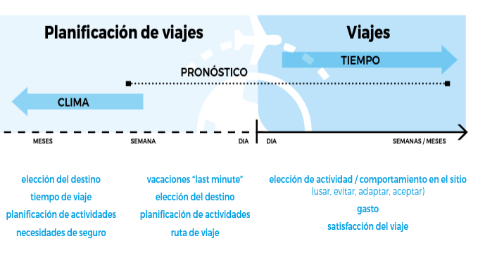 La exhaustiva recopilación de información histórica sobre la frecuencia, magnitud e intensidad del suceso, ayudará a determinar el nivel de riesgo del área o elemento expuesto, teniendo también en cuenta para llegar a su determinación, la vulnerabilidad previamente estudiada y tomar en base al clima observado decisiones informadas sobre planificación urbanística de la ciudad turística, en función del riesgo. Las proyecciones climáticas, simulan a partir de la información histórica disponible y considerando la cadena de incertidumbres, escenarios de riesgos a largo plazo, que permitirán a quienes planifiquen, identificar riesgos futuros y anticipar criterios de planificación urbanística y/o soluciones de mitigación y adaptación. La predicción del tiempo a corto y medio plazo (horas, días, semanas), suministrará información para la toma de decisiones operacionales de la actividad turística (reserva de un viaje, programación y modificación de actividades e itinerarios, decisiones de logística y suministros, información sobre alertas y medidas preventivas, etc.).