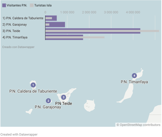 Figura 68 Visitantes a Parques Nacionales y Turistas alojados por isla. 2017. Fuente: Ministerio de