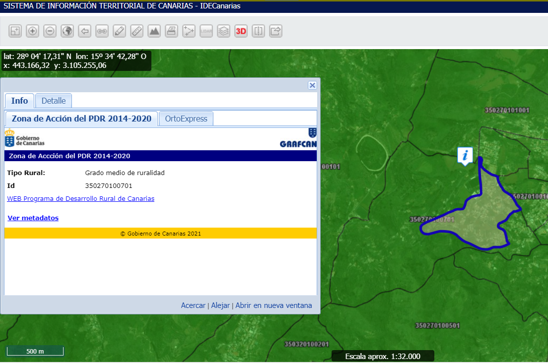 través del visor IDECanarias, capa Agricultura, Ganadería y Pesca/Zonas Rurales/Zona de Acción PDR 2014-2020, en https://visor.grafcan.es/visorweb/ :
