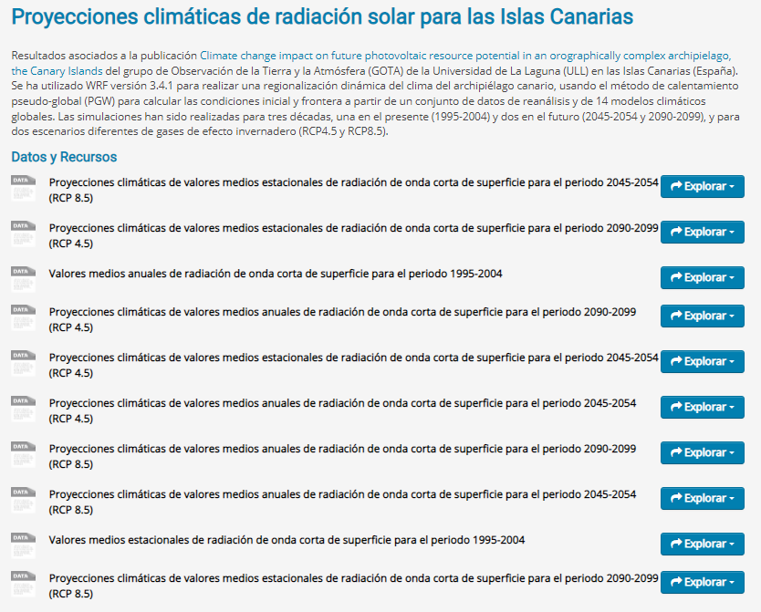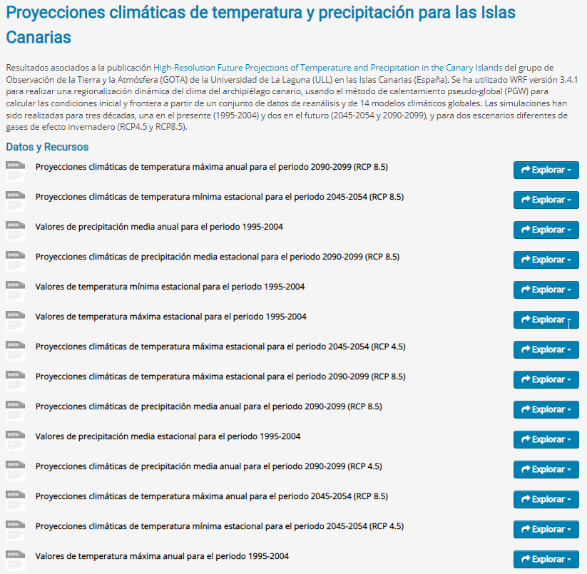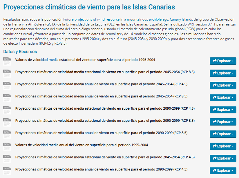 La información más reciente, la ofrece Datos Canarias, que incorpora, a través de la federación de datos, con el Sistema de Información Territorial de Canarias (SITCAN), tres de los trabajos realizados por el Grupo de Observación de la Tierra y la Atmósfera (GOTA) de la Universidad de La Laguna. En concreto, son los resultados de tres publicaciones hechas desde GOTA en las que se analizan las proyecciones climáticas de viento; radiación solar, temperatura y precipitación en Canarias.
