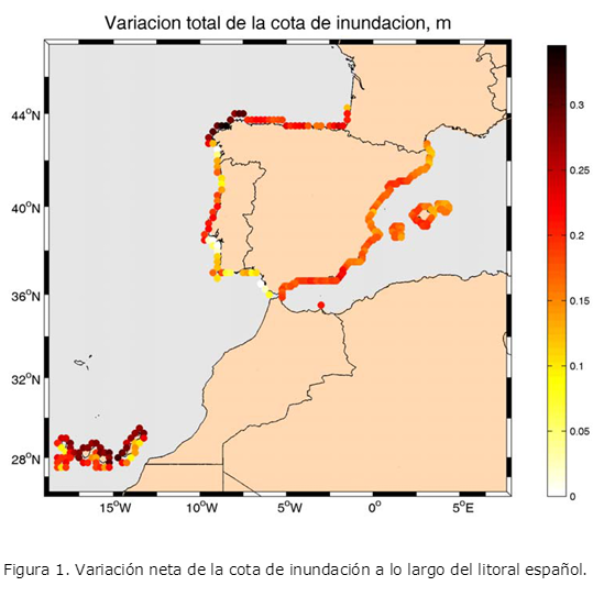 Como dato representativo, y con un horizonte de 50 años, en el Mediterráneo se obtiene un aumento de aproximadamente 20 centímetros, mientras que en la costa gallega y en las islas