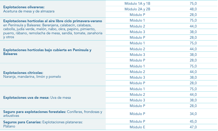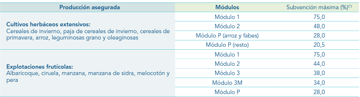 Las y los propietarios de los terrenos, siempre que tengan suscrito un seguro, están a cubierto cuando ocurre un siniestro. De este modo, se protegen los bienes asegurados, se indemnizan las pérdidas en los cultivos por el período cuando por imposibilidad física no se pueda efectuar la recolección (durante el siniestro o los 10 días siguientes al mismo) y por las plagas y enfermedades que se manifiesten (durante el siniestro o los 10 días siguientes al mismo), debido a la imposibilidad de realizar durante ese periodo los tratamientos oportunos. Las producciones agrícolas que susceptibles de ser aseguradas y subvencionados sus daños, en función del módulo de aseguramiento contratado (cada módulo tiene un grado distinto de cobertura), se determinan anualmente por en Plan Anual de Seguros Agrarios elaborado por el MAPAMA, siendo para el año 2018, los siguientes: