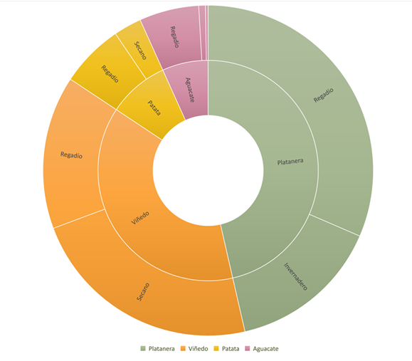 Del mismo modo que los Planes han desarrolla una metodología de vulnerabilidad para edificaciones, también se puede realizar para los cultivos; asignando un grado de vulnerabilidad frente a las distintas amenazas, para cada tipo de cultivo. Así los cultivos en regadío que representa un 57,36% de la superficie cultivada, entre los que se encuentran los cultivos de platanera, viñedo, aguacate y papa, se verán más afectados que los de secano, por la modificación del patrón de precipitaciones ya que la disponibilidad de agua para el riego puede verse afectada y la certidumbre de cuando se tendrá disponibilidad del recurso, situación que además dificulta la toma de decisiones de la personas agricultoras y de las comunidades de regantes.