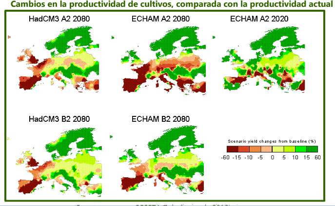 Los cambios en la productividad de los cultivos en Europa han sido modelizados en el proyecto PESETA del Centro de Investigación Conjunta (Joint Research Institute, JRC).