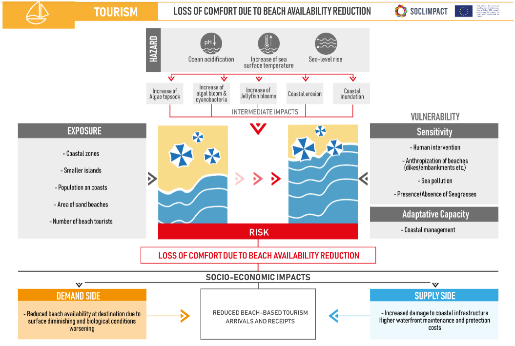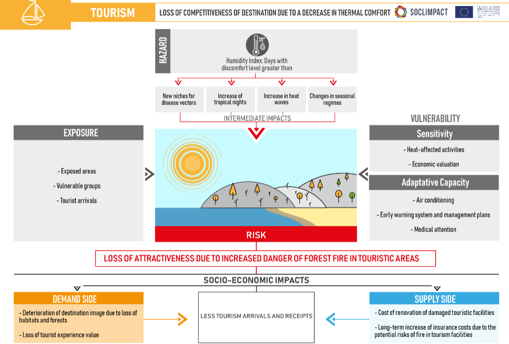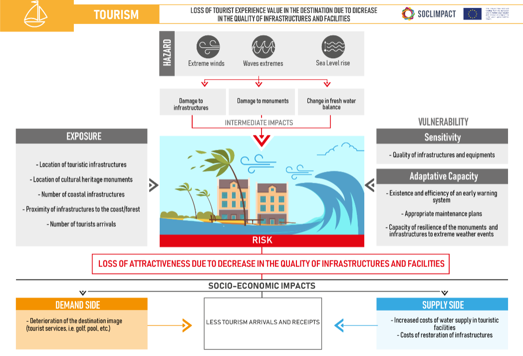 El cambio climático puede afectar a las infraestructuras turísticas y de ocio, como se acaba de decir, especialmente a las situadas en la línea de costa y repercutidas por fenómenos costeros adversos. El proyecto SOCLIMPACT ha analizado las cadenas de impacto probables, en el contexto turístico, desarrollando la siguiente para los impactos sobre las infraestructuras.
