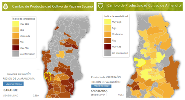 Avanzando, con el ejemplo del Atlas Climático de Chile. Se valora el grado de vulnerabilidad (bajo escenario de altas emisiones RCP8.5) de los cultivos de papa de secano y de almendro, obtenido a partir de características del contexto, con variables como “nivel de ruralidad” y “nivel de diversificación”; valores cercanos al cero (cultivo del almendro) indican una baja sensibilidad del contexto entorno socioeconómico frente al cambio climático, mientras que valores cercanos al 1 (cultivo de papa) indican una alta sensibilidad del entorno socioeconómico al cambio climático.