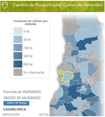 Una forma de representación de la exposición es la que realiza el Atlas Climático de Chile. En los siguientes mapas, se representa el alcance territorial de la exposición (superficie expuesta en hectáreas) de los cultivos de papa de secano y de almendro de dos regiones de Chile (Carahue y Casablanca), y su relación en escala, con la superficie de cultivos de otras regiones.