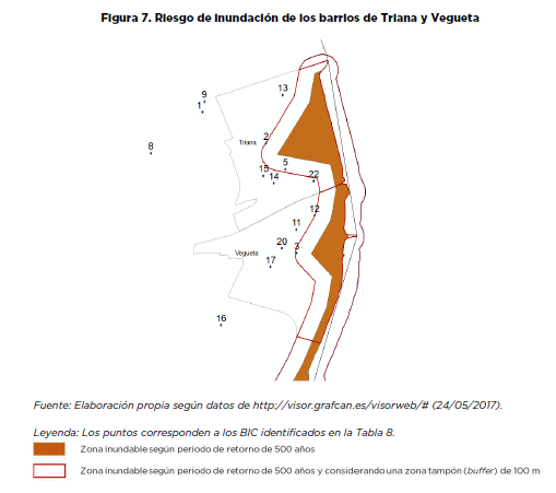 La evaluación de las repercusiones sobre los recursos culturales se desarrolla considerando el riesgo de inundación costera y cómo los bienes de interés cultural de los barrios de Triana y Vegueta se pueden ver afectados: