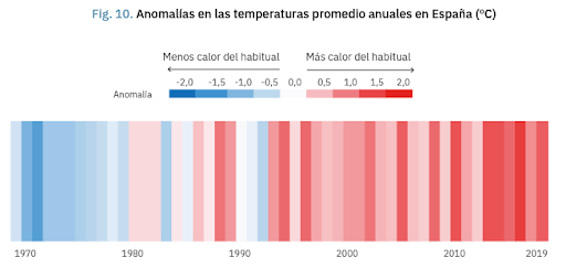 Figura 46. Anomalías en las temperaturas anuales en España. Fuente: España 2050, Fundamentos y propuestas para una Estrategia Nacional de Largo Plazo. https://www.lamoncloa.gob.es/presidente/actividades/Documents/2021/200521-Estrategia_Espana_2050.pdf
