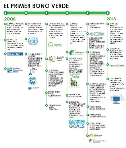 En noviembre de 2008 se emitió el primer bono verde del Banco Mundial, que sirvió de modelo del mercado actual de bonos verdes. Se definieron los criterios para seleccionar proyectos que se financiarían con bonos verdes y se probó un nuevo formato de colaboración entre inversionistas, bancos, organismos de desarrollo y ámbito científico.
