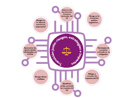 Otro de los aspectos que tienen relevancia en la aproximación a una transición justa tiene que ver, como se ha venido señalando, con la captación de la realidad de la que se parte, y como señala el BSR enfoca la mirada en los riesgos e impactos que supone el afrontamiento de la transición justa así como las estrategias que se asumen.