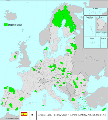 La estrategia Nacional de Transición Justa, en coherencia con la propuesta de la Unión Europea, ha realizado una primera propuesta de las zonas que van a ser más afectadas por el proceso de descarbonización, la mayoría de las cuales ya se enfrentaban al fenómeno de despoblación y crisis económica, situación que agrava las consecuencias que para estas regiones traerá la transición climática.