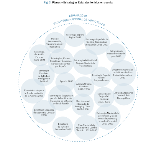 La visión holística y de futuro, que el Informe España 2050 plasma, integra las perspectivas contenidas en los instrumentos de planificación de políticas sectoriales y en las actuaciones de las áreas de gobierno; considerando la Agenda 2030 y los planes y estrategias que a nivel nacional se han ya desarrollado (Estrategia de Descarbonización a Largo Plazo 2050, Agenda Urbana Española, etc.), para esbozar las futuras oportunidades y desafíos a enfrentar.