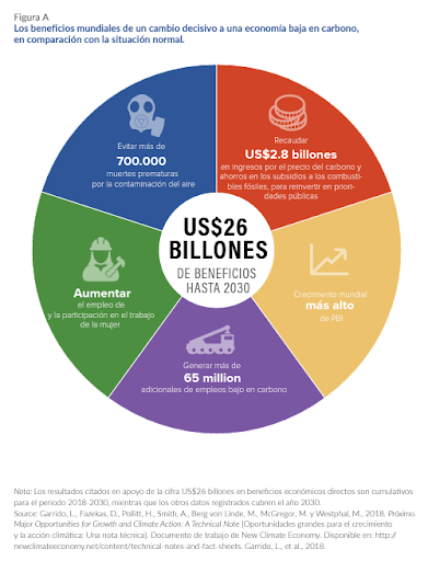 A nivel global, la organización “Nueva Economía Climática” (NCE, en inglés), publica, a partir de trabajos de investigación de Garrido et. al, los beneficios económicos que el crecimiento bajo en carbono podría generar para 2030: