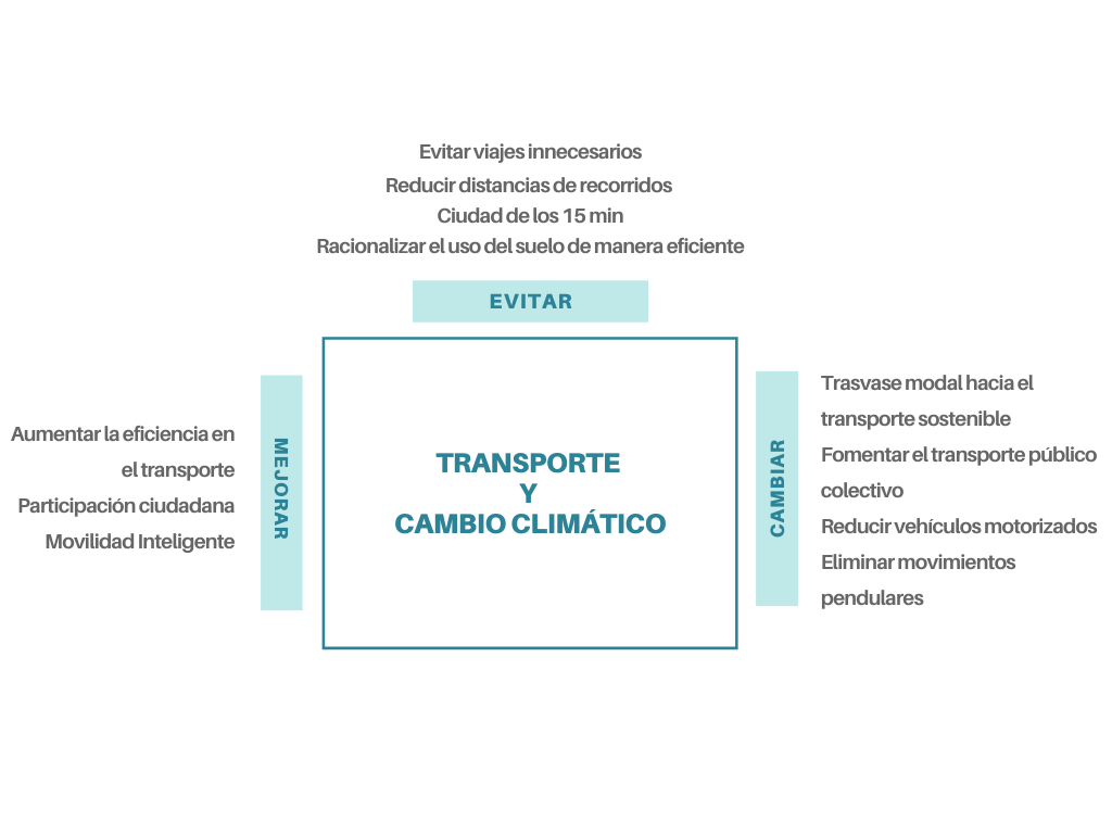 En el documento “Transporte y cambio climático: hacia un desarrollo sostenible y de bajo carbono” se plantea un nuevo enfoque de transformación del sector denominado: “Evitar-Cambiar-Mejorar” (ASI por sus siglas en inglés) el cual establece unos principios rectores para lograr de manera eficaz el objetivo de reducir las emisiones de gases de efecto invernadero en proyecciones futuras a partir de sistemas de bajo costo y accesibles para su implementación.