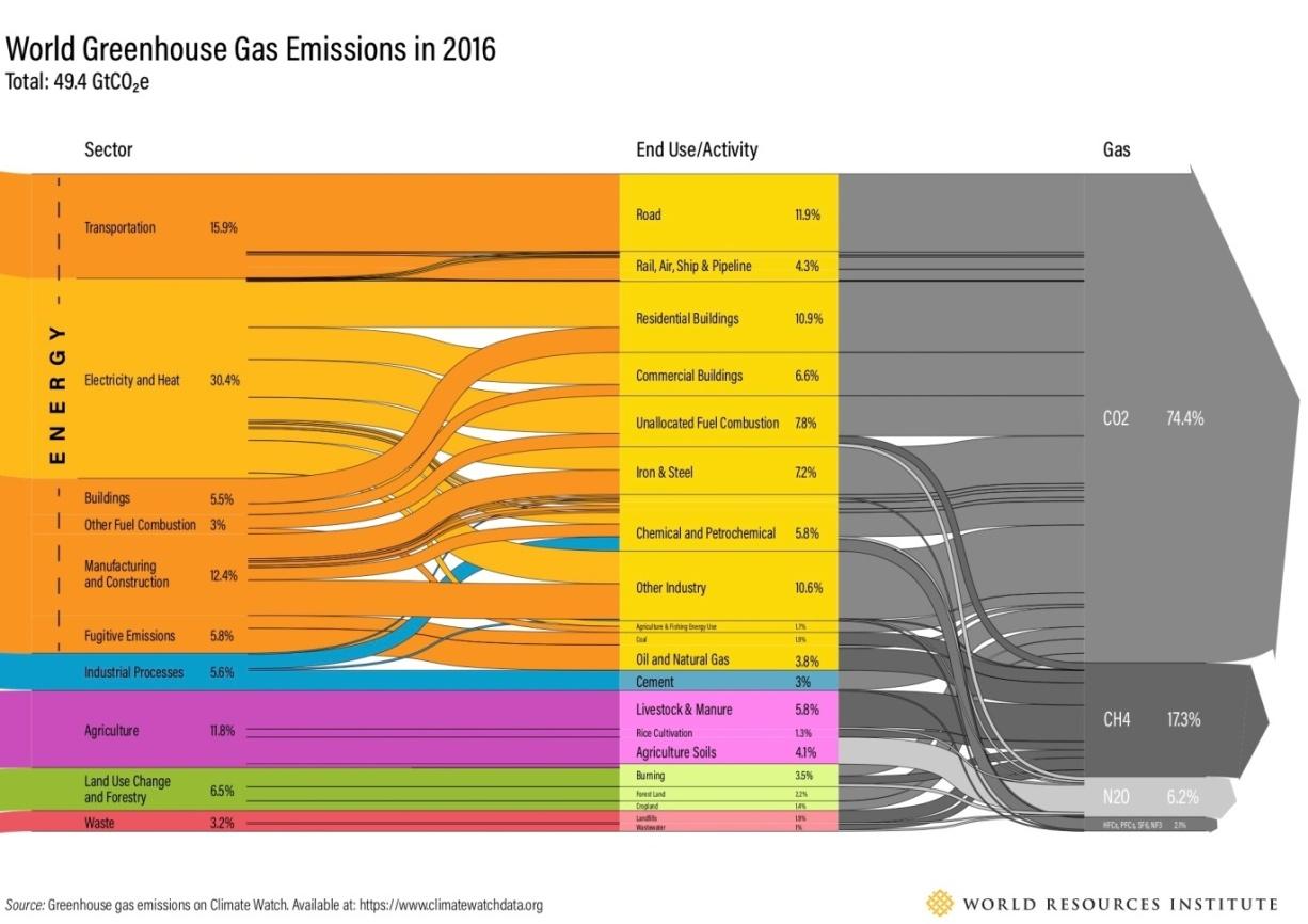 Figura 23. Emisiones Mundiales de GEI en 2016 (por sectores, actividad y tipo de gas).                                                      Fuente: World Resources Institute, Climate Analysis Indicator Tool (CAIT).