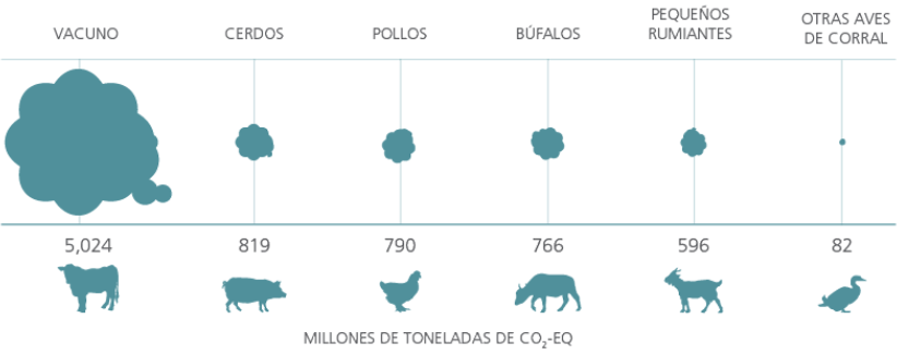 Además, partiendo del hecho de que los alimentos pasan por una cadena de producción (almacenamiento, elaboración, envasado y transporte) que generan GEI, resulta obligatorio destacar el óxido nitroso presente en fertilizantes nitrogenados orgánicos y minerales, además del metano que producen de forma natural las especies ganaderas (fermentación entérica), especialmente la bobina.