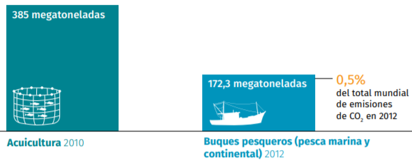 Asimismo, en el caso de los alimentos derivados del mar, según estimaciones mundiales de la FAO, la acuicultura generó 385 megatoneladas de dióxido de carbono en 2010 (incluidas las emisiones ligadas con la captura de peces para la elaboración de piensos), mientras que en 2012 los buques pesqueros (tanto marítimos como continentales) emitieron 172,3 megatoneladas.