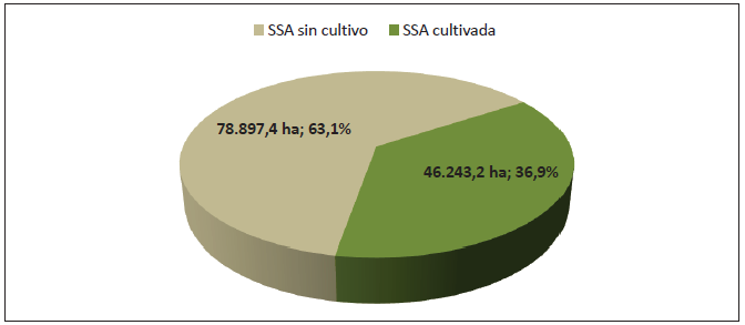 Figura 31: Distribución de la superficie del sistema agrícola cultivada y sin cultivo con respecto a la superficie total del sistema agrícola en Canarias. Hectáreas.