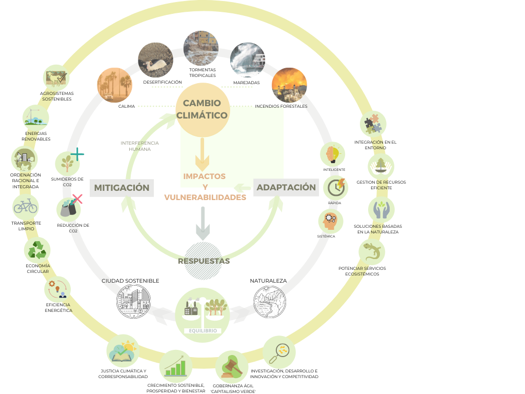 El cambio climático implica la transformación progresiva de variables climáticas, como el aumento de temperaturas o la variación en el régimen de lluvias, además de la alteración de los patrones habituales de eventos extremos, como la mayor severidad y asiduidad de olas de calor, las sequías o las lluvias torrenciales. Estos cambios repercutirán en la subida del nivel del mar o en la variación del régimen hídrico, que se traducirá a su vez en impactos, pero también en oportunidades en el medio ambiente, la sociedad y la economía. Estos impactos, entre otras muchas cuestiones, condicionarán la permanencia o, incluso, supervivencia de especies, el desplazamiento de ecosistemas, repercutirá en la productividad, los sistemas agrícolas, en la habitabilidad de los espacios, la salud humana, las condiciones turísticas, la seguridad, el empleo, etc…