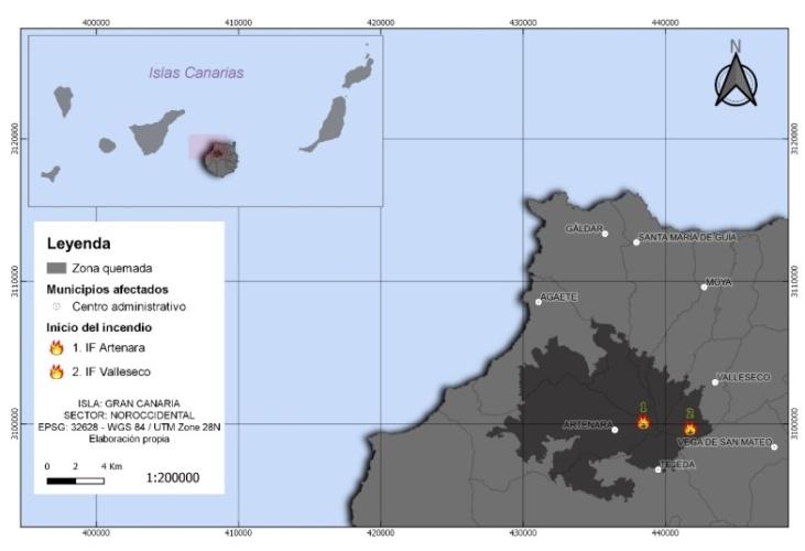 Figura 82. Delimitación del gran incendio forestal de 2019 de Gran Canaria. Fuente: Artículo: Severidad y posterior recuperación de la vegetación afectada por el incendio forestal de Gran Canaria de 2019 a través de datos Sentinel-2. Disponible en: www.nosolosig.com