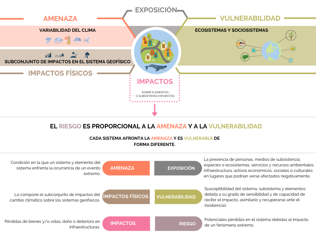 Figura 78 Esquema explicativo entre amenazas, impactos, exposición, vulnerabilidad e impactos. Fuente: elaboración propia a partir de las definiciones del IPCC.