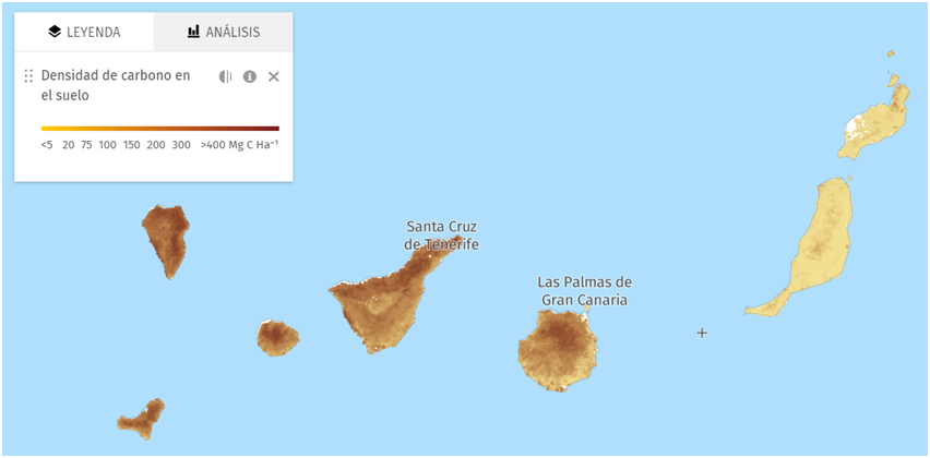 Figura 31. Densidad de carbono en el suelo de Canarias. Fuente: Global Forest Watch.