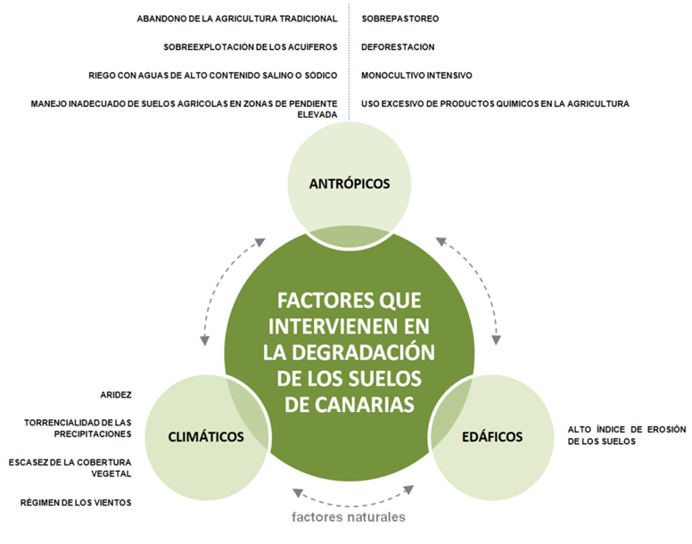 Figura 32. Factores que intervienen en la degradación de los suelos de Canarias. Fuente: Elaboración propia a partir de “Canarias: Economía, Ecología y Medio Ambiente” (1994). AGUILERA KLINK, F. (et al).