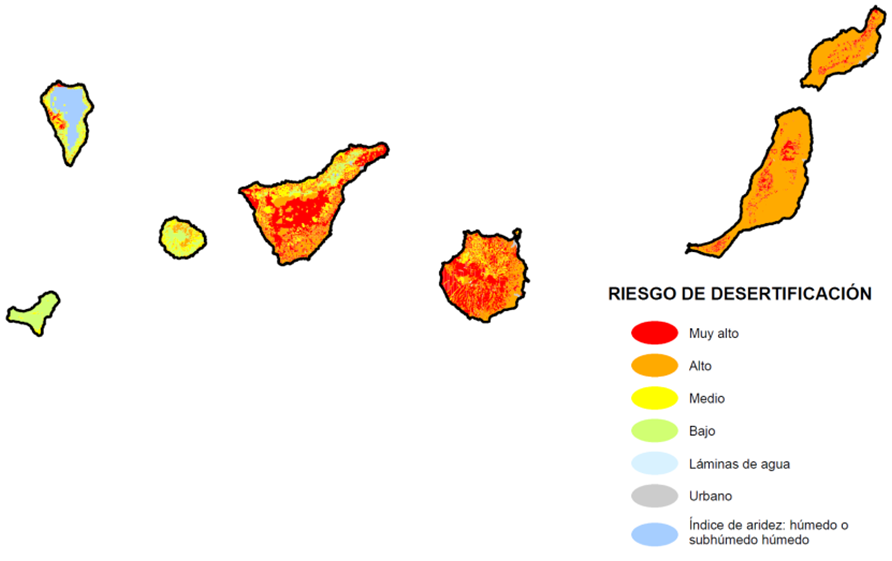 En este sentido y según el Consejo Social de la Universidad de La Laguna, el riesgo de desertificación en Canarias es aproximadamente el 70% de la superficie del territorio, siendo el 100% en las islas orientales (Fuerteventura y Lanzarote), el 90% en Gran Canaria, el 85% en La Gomera, el 79% en El Hierro y el 70% en Tenerife.