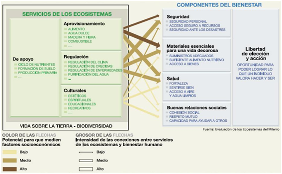 La provisión de estos beneficios es el resultado del propio funcionamiento de los ecosistemas y queda reflejado en el concepto de servicios ecosistémicos (SE). En este sentido, el IPCC define a los servicios ecosistémicos como los “procesos o funciones ecológicos que tienen un valor, monetario o no, para los individuos o para la sociedad en su conjunto. Generalmente se clasifican en: 1) servicios de apoyo, por ejemplo, mantenimiento de la productividad o la biodiversidad; 2) servicios de aprovisionamiento, por ejemplo, de alimentos o fibra; 3) servicios de regulación, por ejemplo, regulación del clima o secuestro de carbono; y 4) servicios culturales, como el turismo o el disfrute espiritual o estético”.