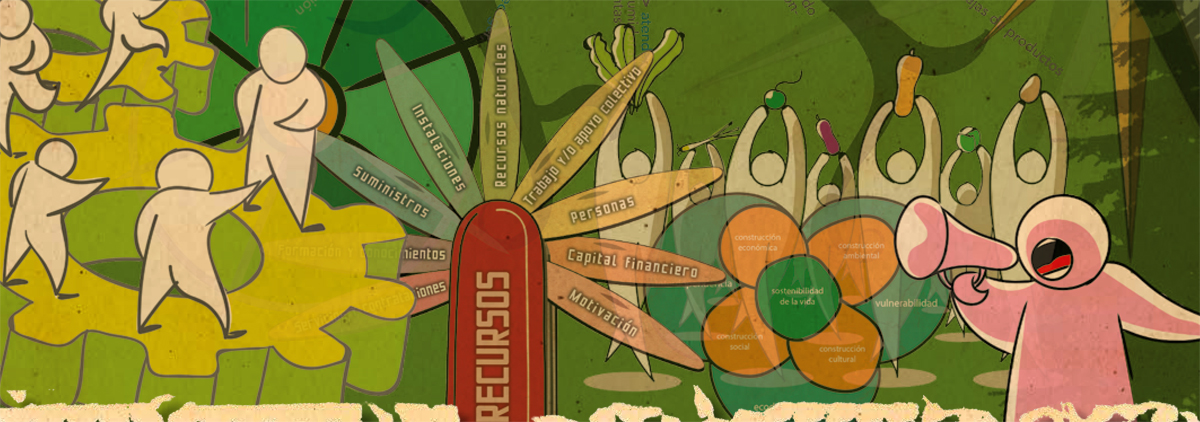 Figura 66. Viñeta que representa la interacción social, los recursos naturales, la sostenibilidad y la seguridad alimentaria. Fuente: www.soberaniaalimentaria.inf.