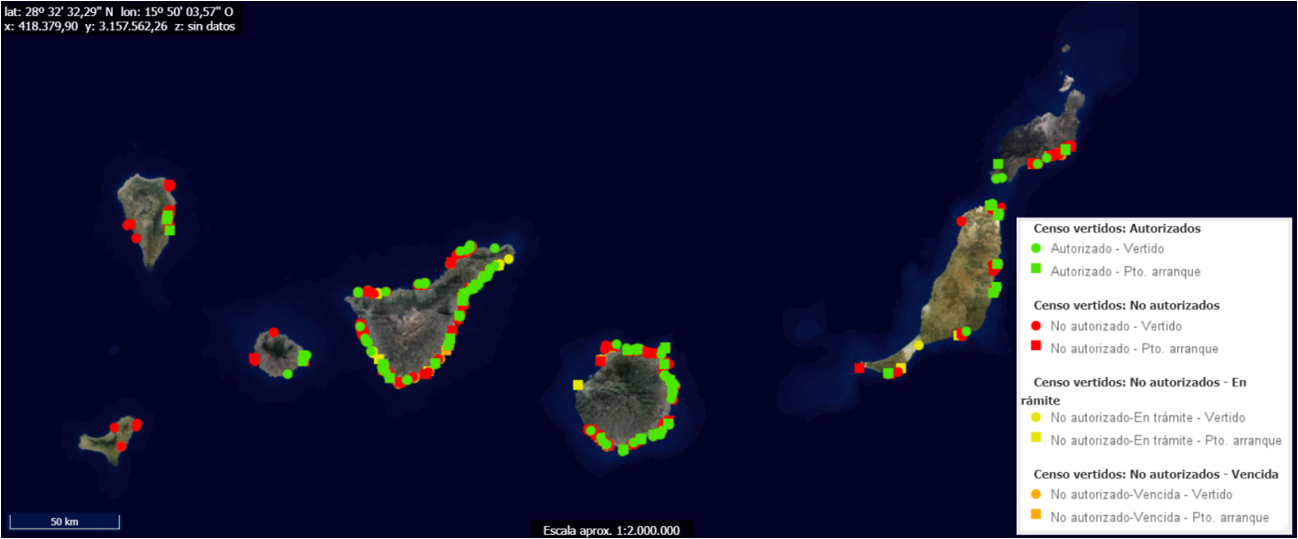 Figura 72. Censo de vertidos desde tierra al mar, que no solo ponen en jaque los ecosistemas submarinos de gran valor ecológico, sino también la actividad pesquera y la acuicultura. Fuente: IDE CANARIAS.